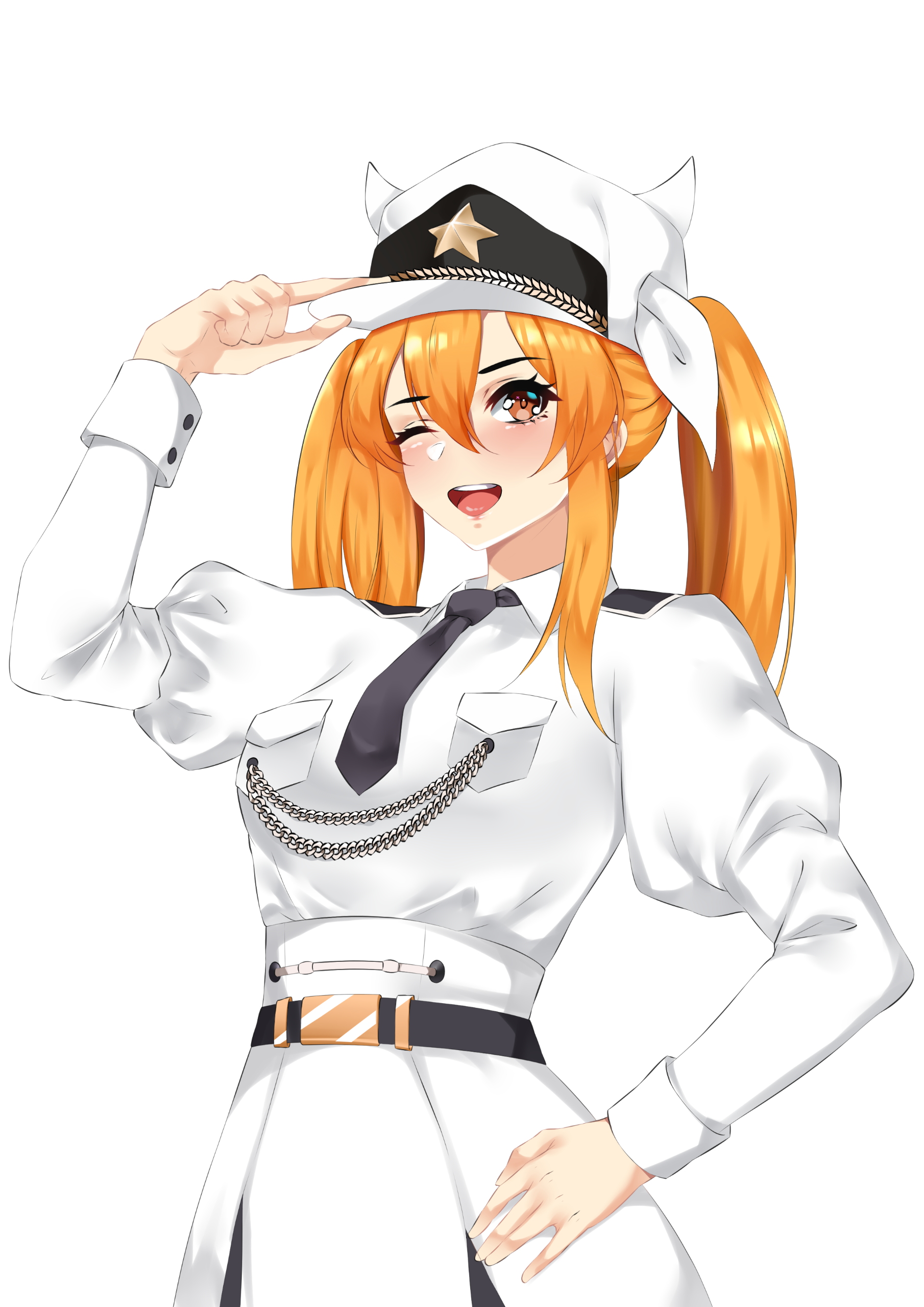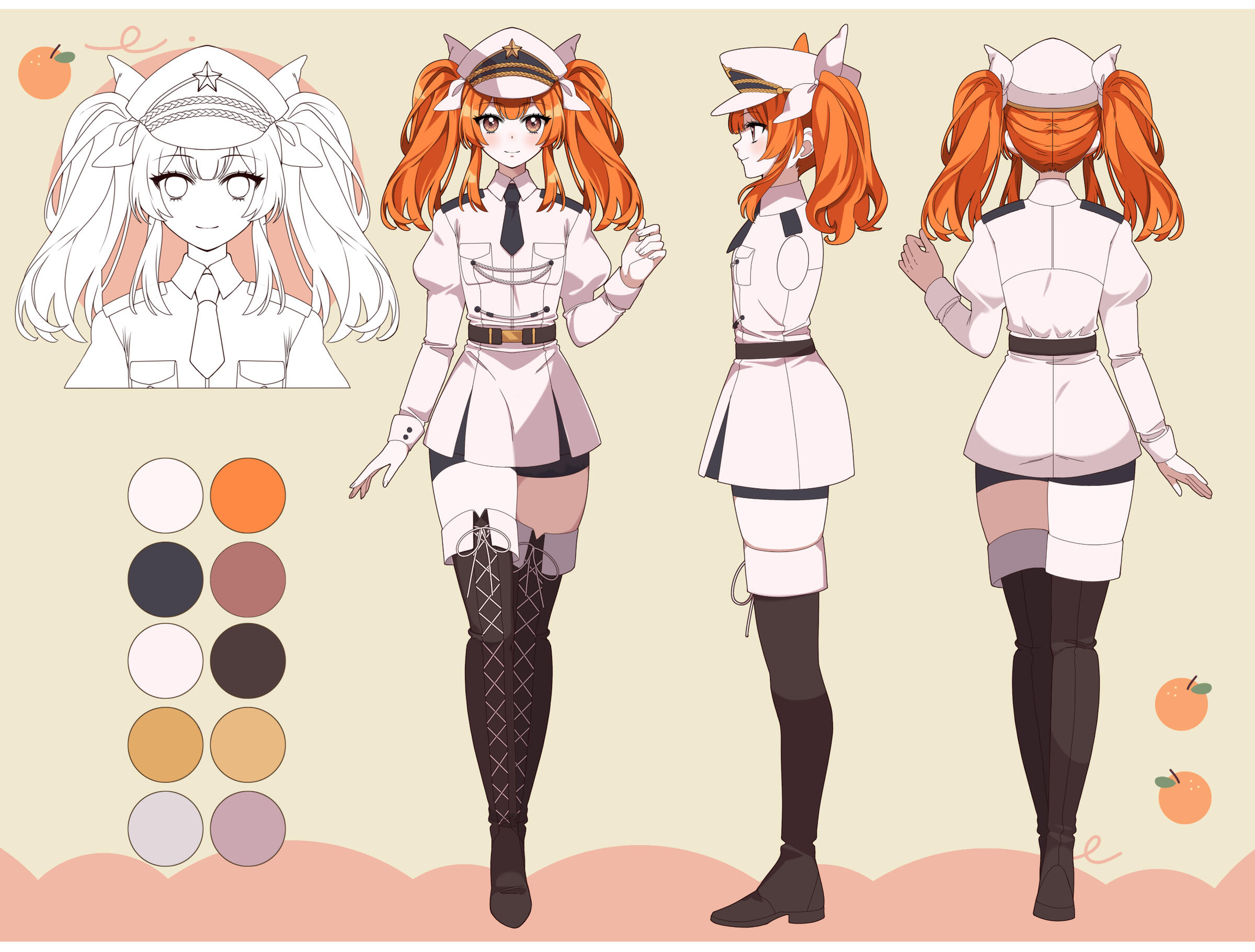 Admiral Trina is a vibrant and energetic leader, embracing eternal youth and unwavering optimism. Standing at 160 cm (63 inches), she fully embraces her petite stature, often playfully acknowledging it.She has striking orange hair, typically styled into her signature twintails adorned with bows or hair clips. Her warm brown eyes may not actually glow in the dark, but she certainly has a presence that shines wherever she goes.